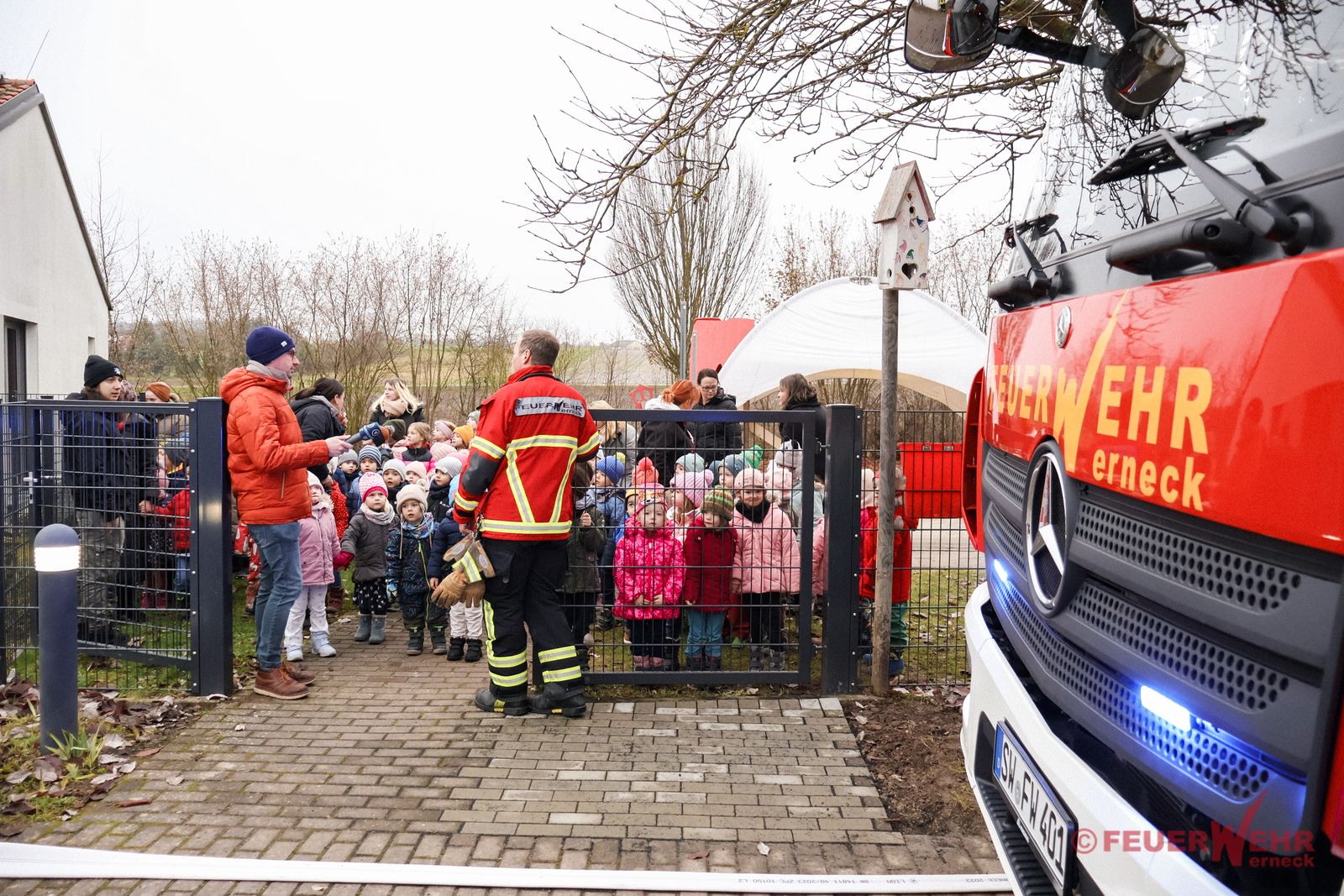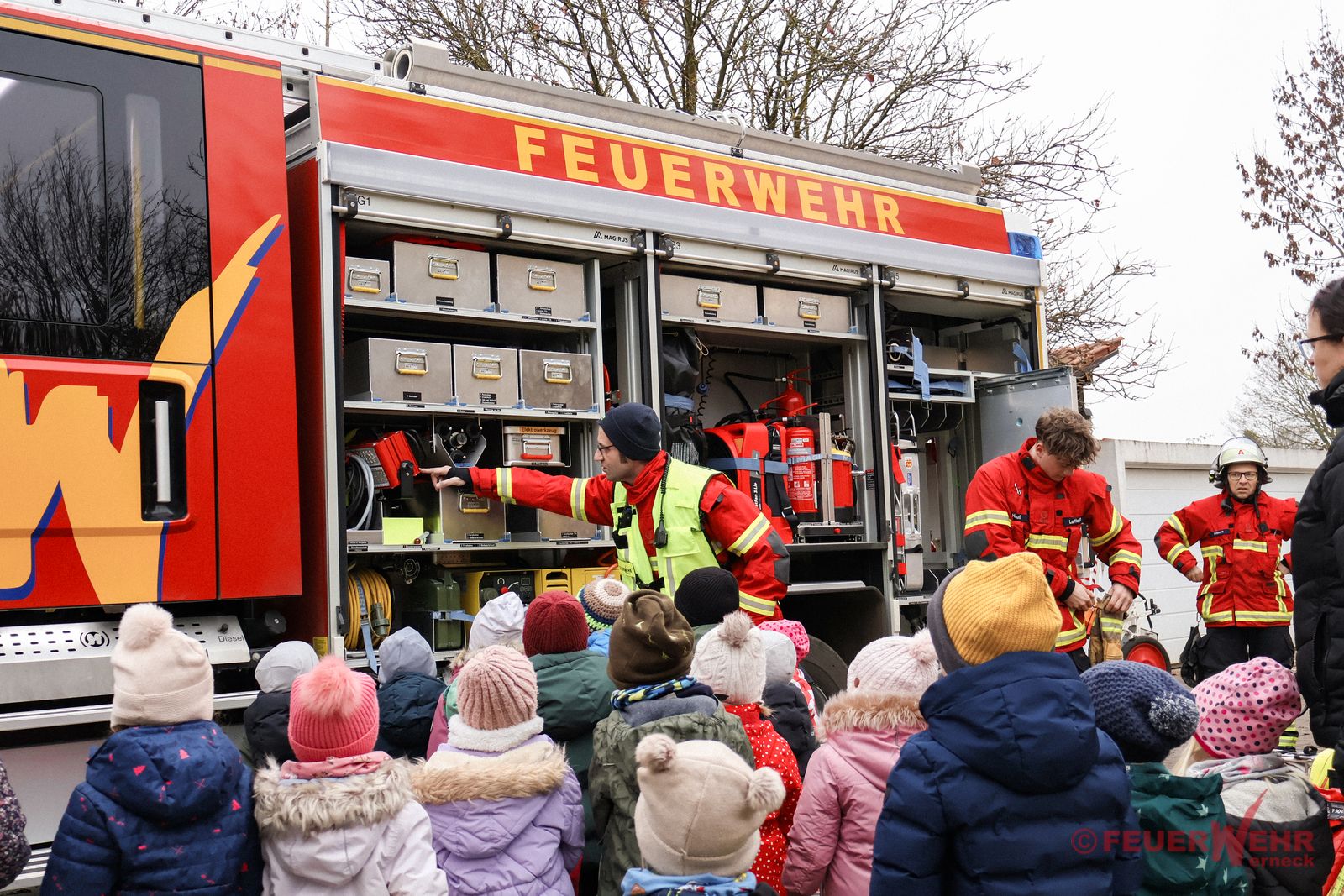 Im Foyer hatten die Ehrenamtlichen der Feuerwehr Werneck einige Lehrmittel aus ihrem brandneuen Brandschutzerziehungsanhänger vorbereitet und brachten den Kindern viele Themen rund um Feuer und Rauch sowie das richtige Verhalten im Notfall näher.