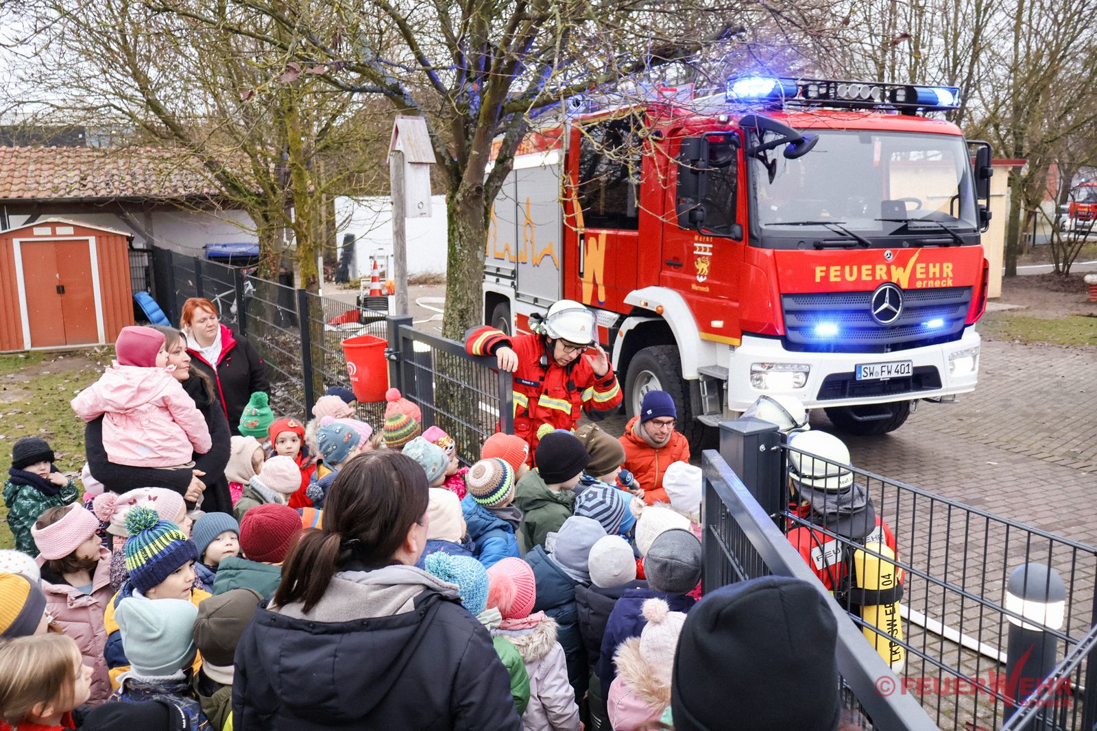 Vor der Tür konnten die Kinder neben dem Hilfeleistungslöschgruppenfahrzeug auch die Drehleiter hautnah und in Aktion erleben. Mit leuchtenden Augen genossen die Kinder es sichtlich, einmal selbst in einem Feuerwehrauto zu sitzen und sich wie echte Feuerwehrleute zu fühlen.