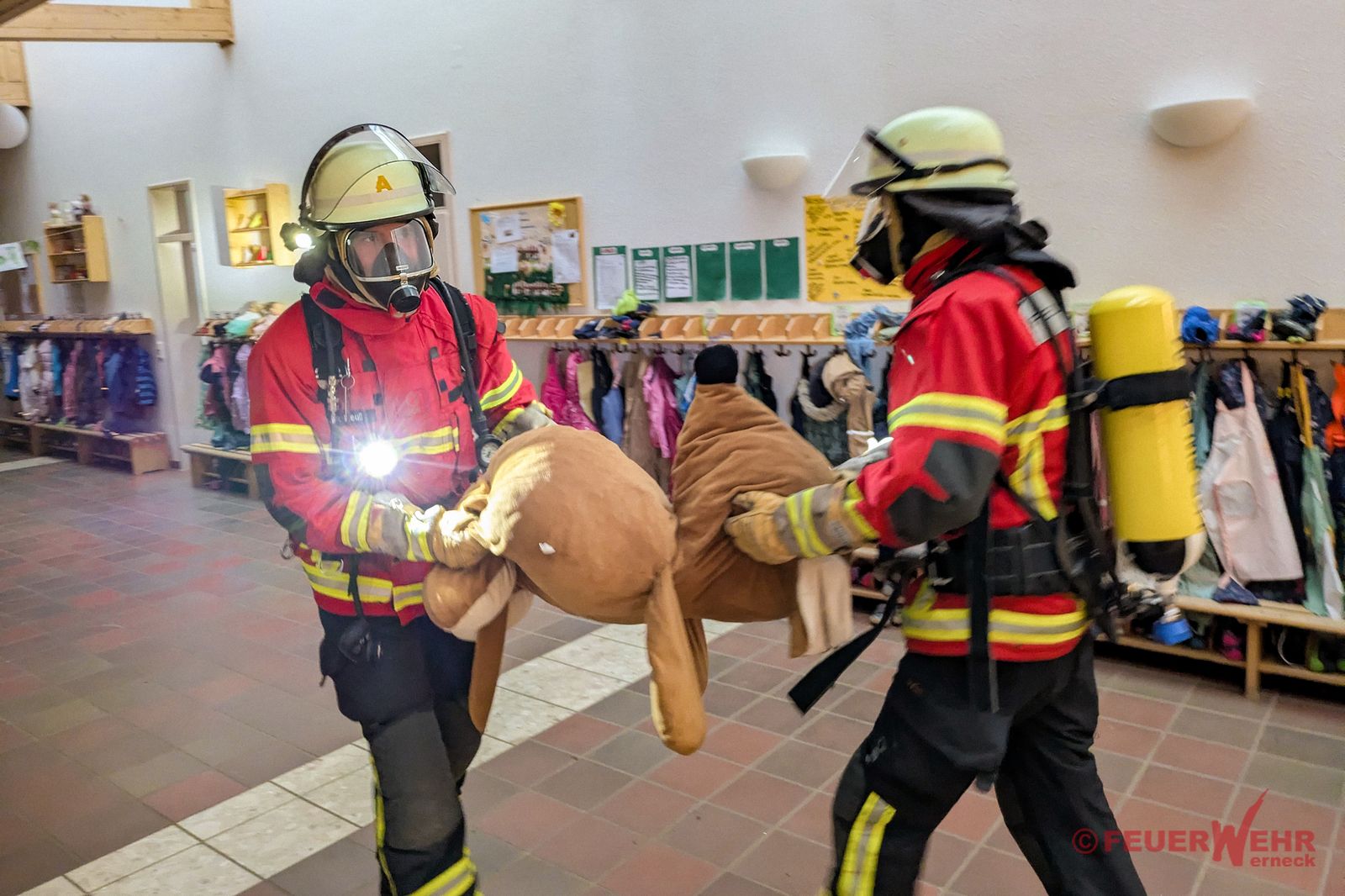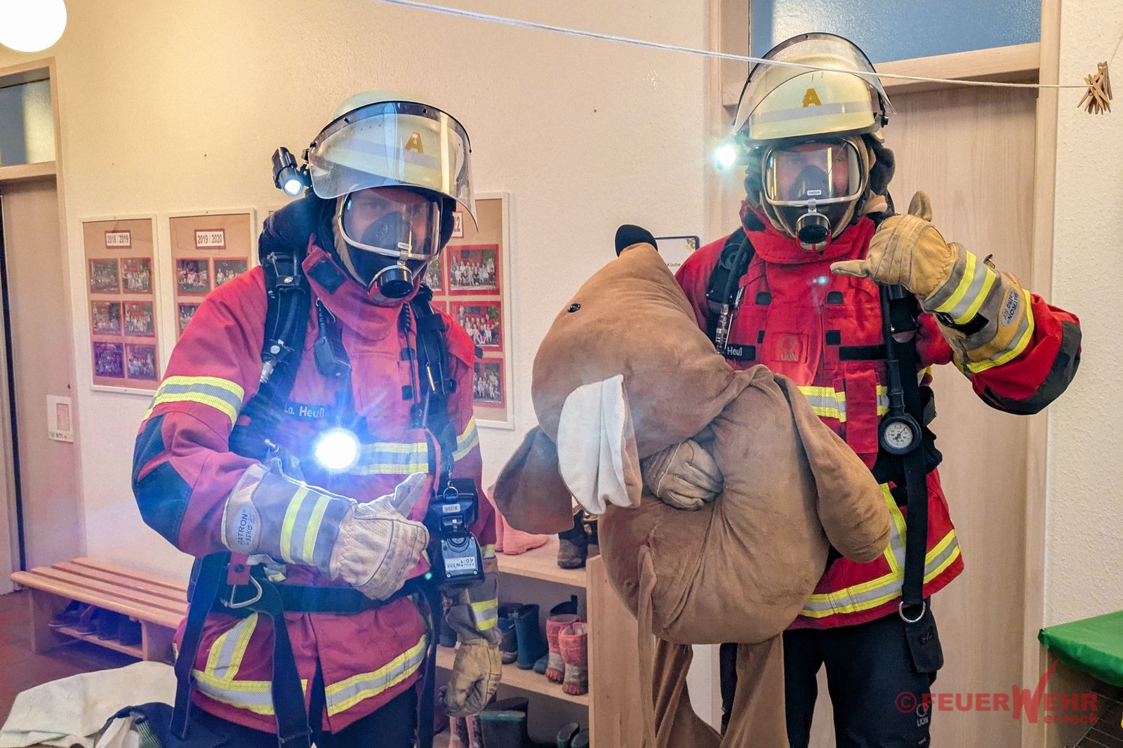 Zwei Atemschutzträger machten sich sofort auf ins verrauchte Gebäude und konnten das vermisste Kuscheltier sicher ins Freie retten. Auch der Disconebel war dank Überdruckbelüftung schnell verzogen, sodass die Kinder zurück ins Gebäude konnten.