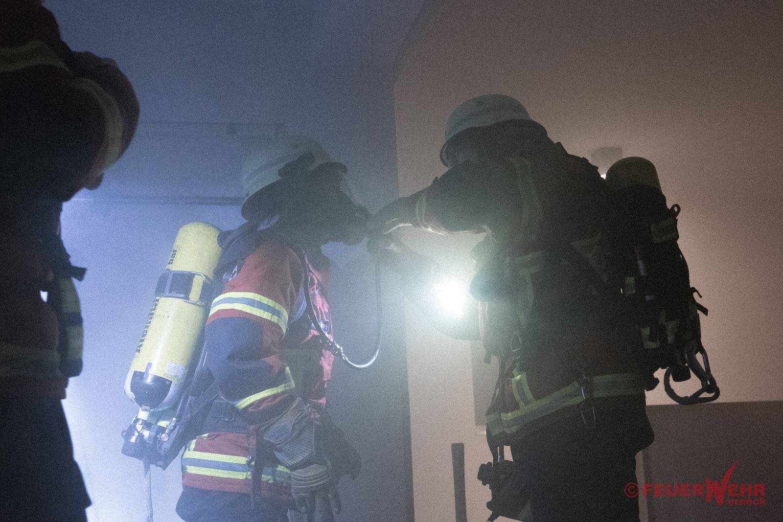 Der unübersichtliche und weit verzweigte Keller verlangte den eingesetzten Trupps viel ab. Durch Nebelmaschinen herrschte realistische Nullsicht, sodass sich die Einsatzkräfte ausschließlich kriechend und mit Handwerkzeugen als Orientierungshilfe vortasten konnten. Raum für Raum musste gründlich durchsucht werden, um sicherzustellen, dass keine der vermissten Personen übersehen wurde.
