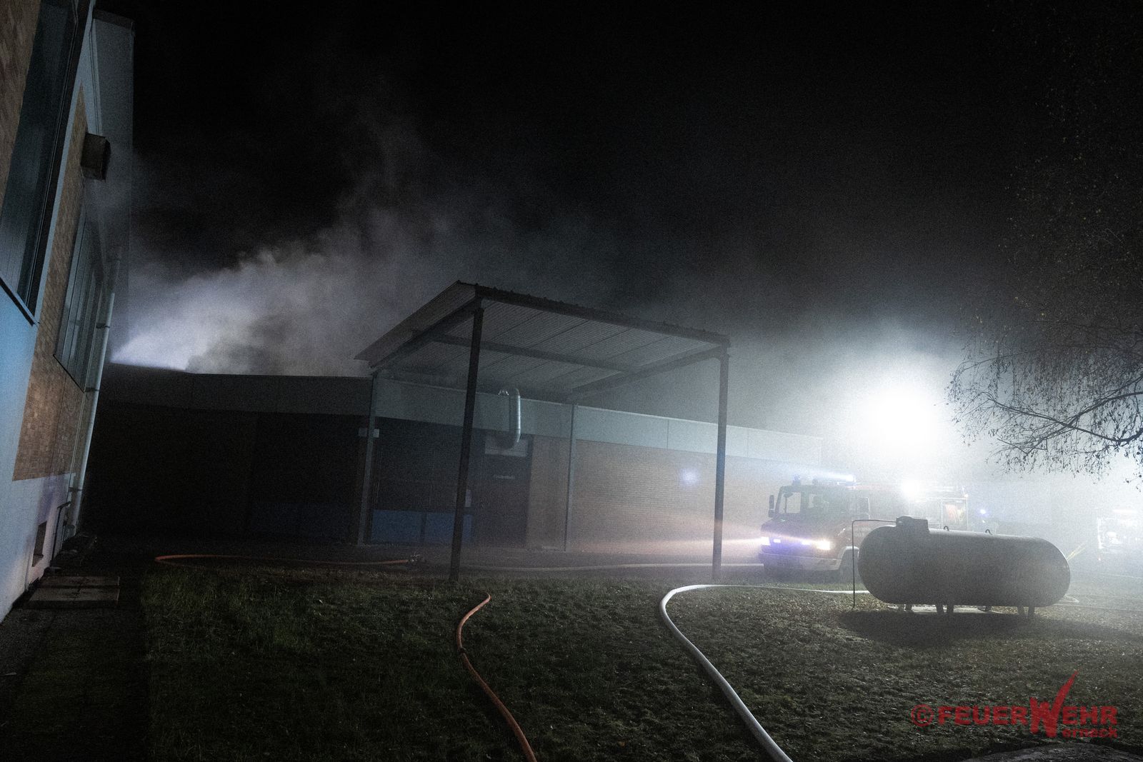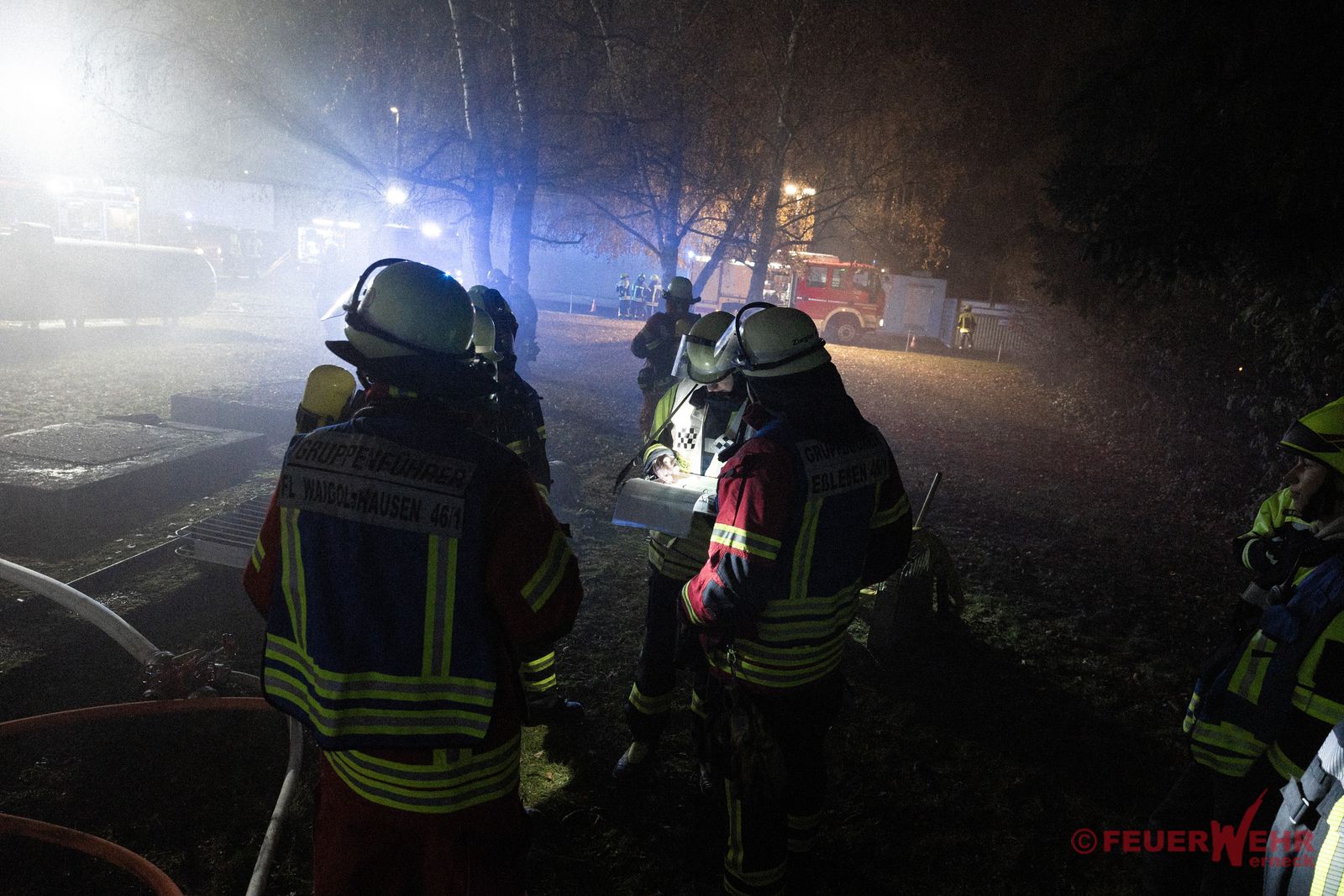 Etwa anderthalb Stunden nach Alarmierung konnte die Übungsleitung die Großübung erfolgreich beenden. Es folgte ein umfangreicher Rückbau: mehrere hundert Meter Schlauchleitung mussten aufgerollt werden, die Verkehrssicherung abgebaut, das Gebäude vom Übungsnebel befreit und zahlreiche Atemschutzgeräte ausgetauscht werden. Zudem wurden die Pumpen entwässert und alle Fahrzeuge wieder einsatzbereit gemacht.