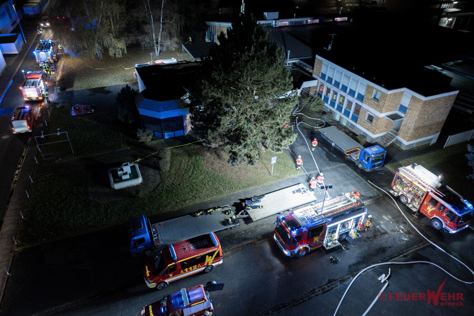 Unverzüglich wurde eine Wasserversorgung aufgebaut, und der erste Angriffstrupp unter schwerem Atemschutz begann mit der Personensuche im weitläufigen Kellergeschoss. Aufgrund der Vielzahl vermisster Personen folgten kurz darauf weitere Atemschutztrupps der Feuerwehren aus Bergrheinfeld, Schnackenwerth, Eßleben und Waigolshausen. Parallel richtete die Feuerwehr Ettleben eine Wasserentnahme an der Wern ein, während die Feuerwehr Zeuzleben zusammen mit dem HvO Mühlhausen eine Patientenablage vorbereitete.