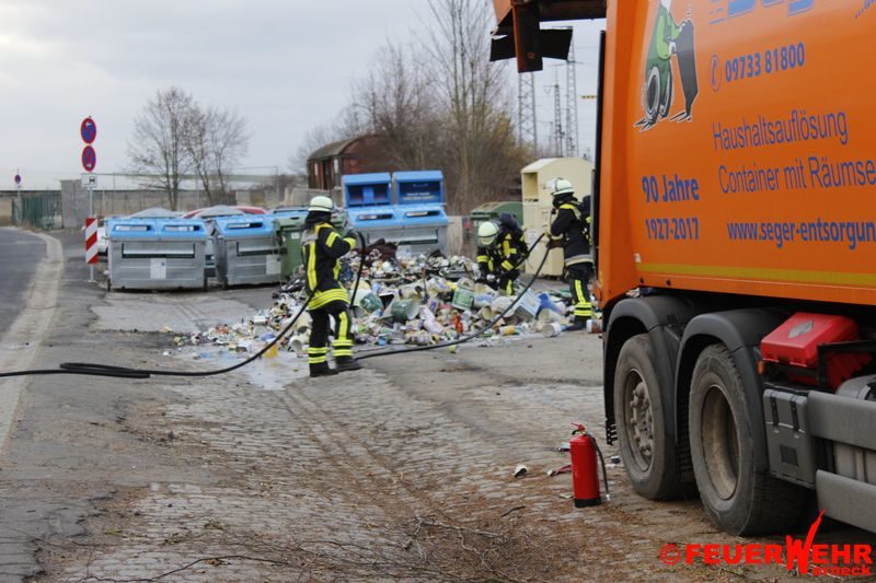 Bereits bei Ausfahrt der Fahrzeuge war klar, dass es sich hierbei um ein Müllauto handelte, dessen Ladung zu brennen begonnen hat. Vor Ort wurde die Ladung des Fahrzeuges durch den Angriffstrupp des Werneck 20/1 unter Pressluftatmer abgelöscht.