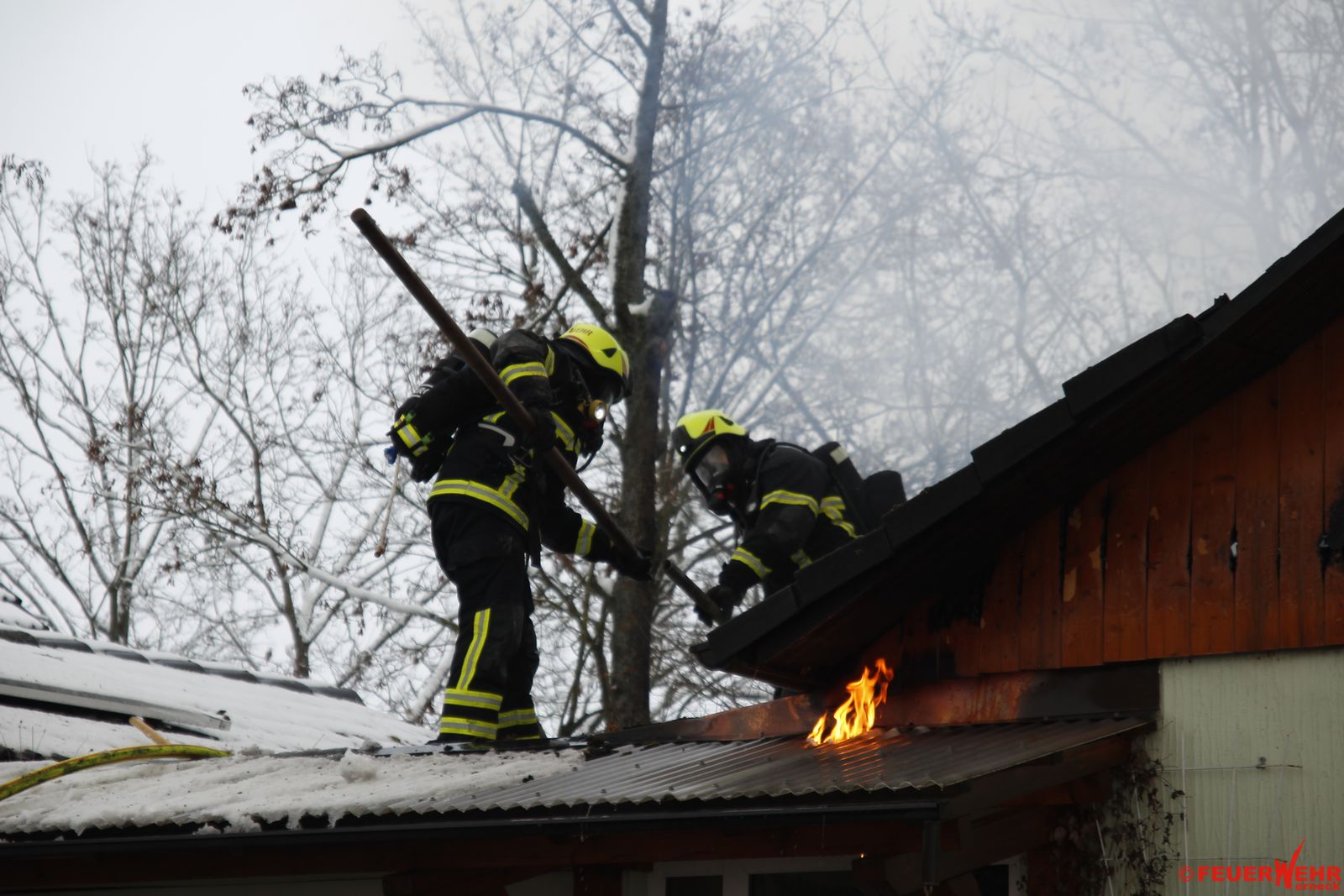 Bei Eintreffen der Einsatzkräfte aus Werneck war bereits ein Übergreifen des Brandes auf das angebaute Wohnhaus zu erkennen, so dass schnellstmöglich der Löschangriff über mehrere Wege aufgebaut wurde. Zeitgleich ging der erste Angriffstrupp zur Personensuche in das Wohngebäude vor. Bereits nach wenigen Minuten stand der gesamte Dachstuhl des Wohngebäudes in Vollbrand, sodass sich der Angriffstrupp im Inneren nach abgeschlossener Personensuche sofort ins Freie zurückziehen musste, da akute Einsturzgefahr bestand.