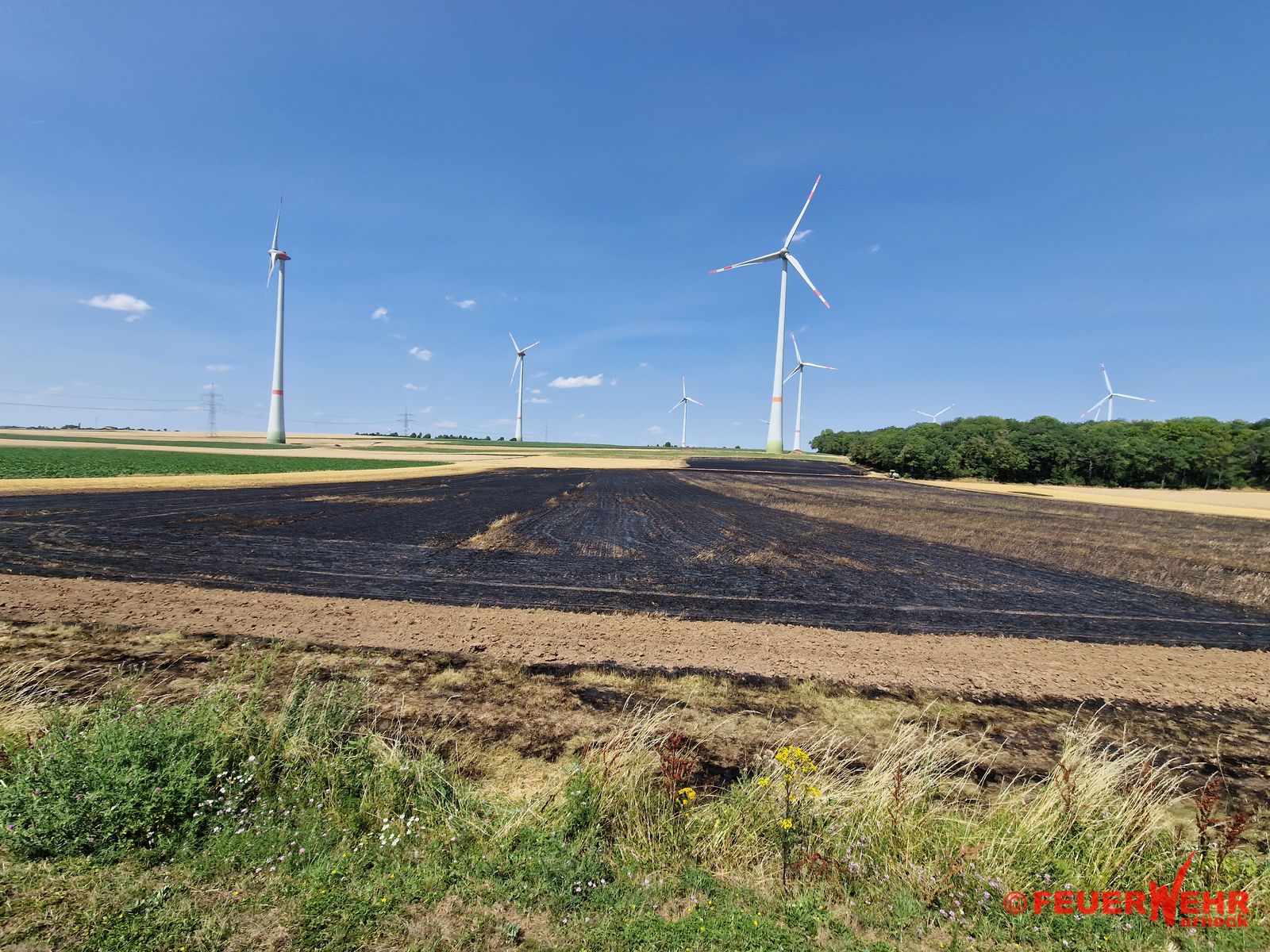 Nur zwei Stunden nach dem Alarm zur Türöffnung klingelten die Meldeempfänger in Werneck erneut. Nahe Opferbaum geriet bei der Ernte ein Getreidefeld über eine Fläche von ca. 4 Hektar in Brand.