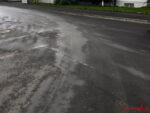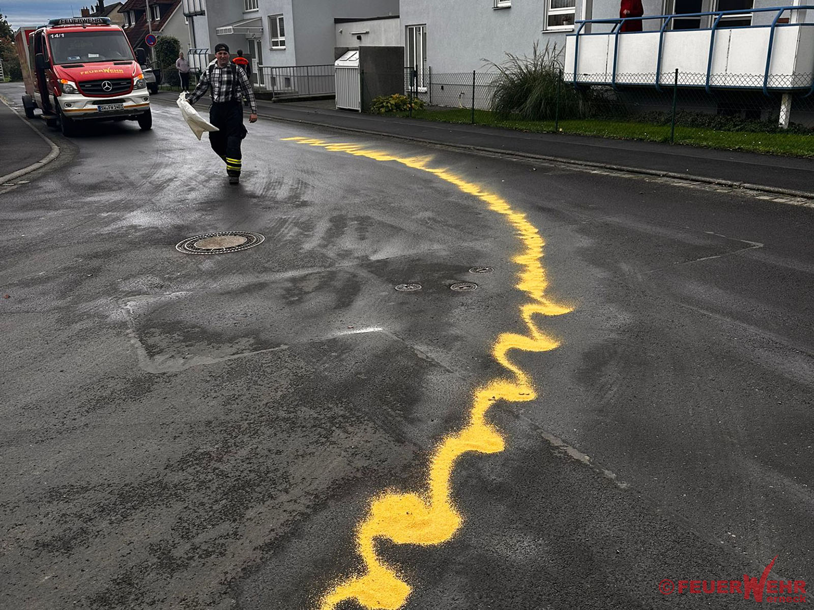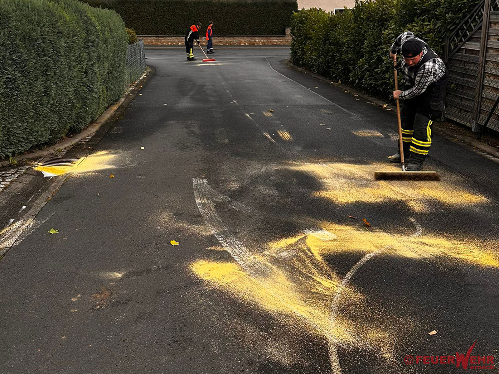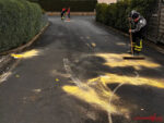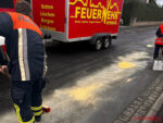 Kurzerhand wurde beschlossen, nach Absprache mit dem anderen Fahrzeug, die ca. 100 Meter lange Ölspur selbst abzubinden.