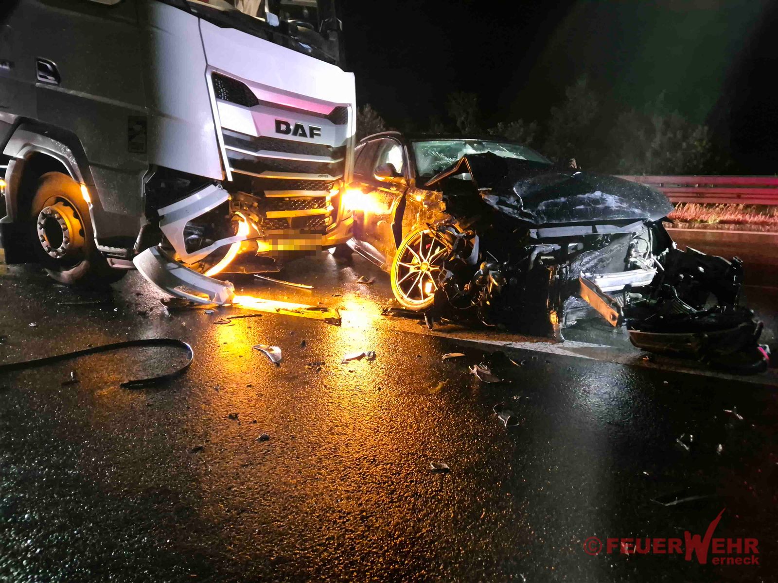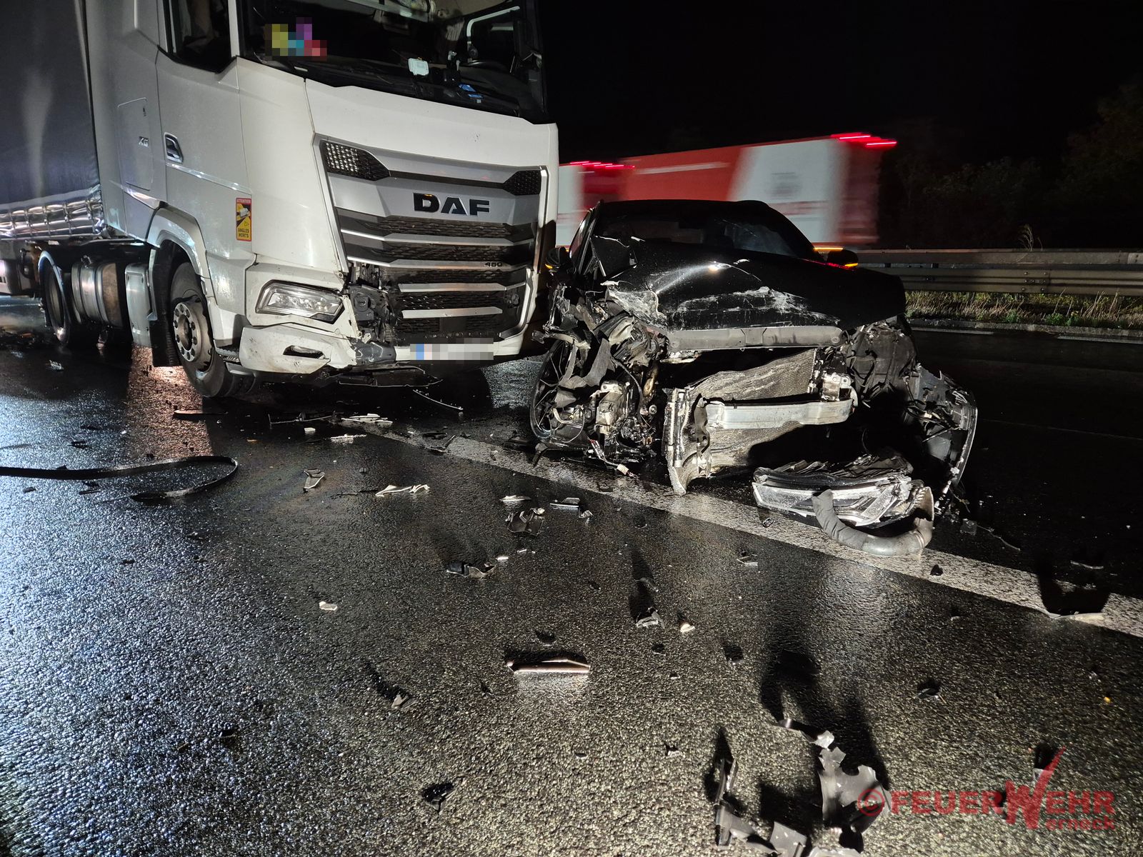 Vor Ort bestätigte sich die Meldung: Nach einer Kollision befanden sich ein PKW und ein LKW auf dem rechten Fahrstreifen. Der PKW war nach dem Zusammenstoß mit der Leitplanke und dem LKW im Front- und Seitenbereich stark beschädigt. Sowohl die beiden Insassen des PKW als auch der Fahrer des LKW blieben jedoch unverletzt und benötigten keine medizinische Versorgung.
