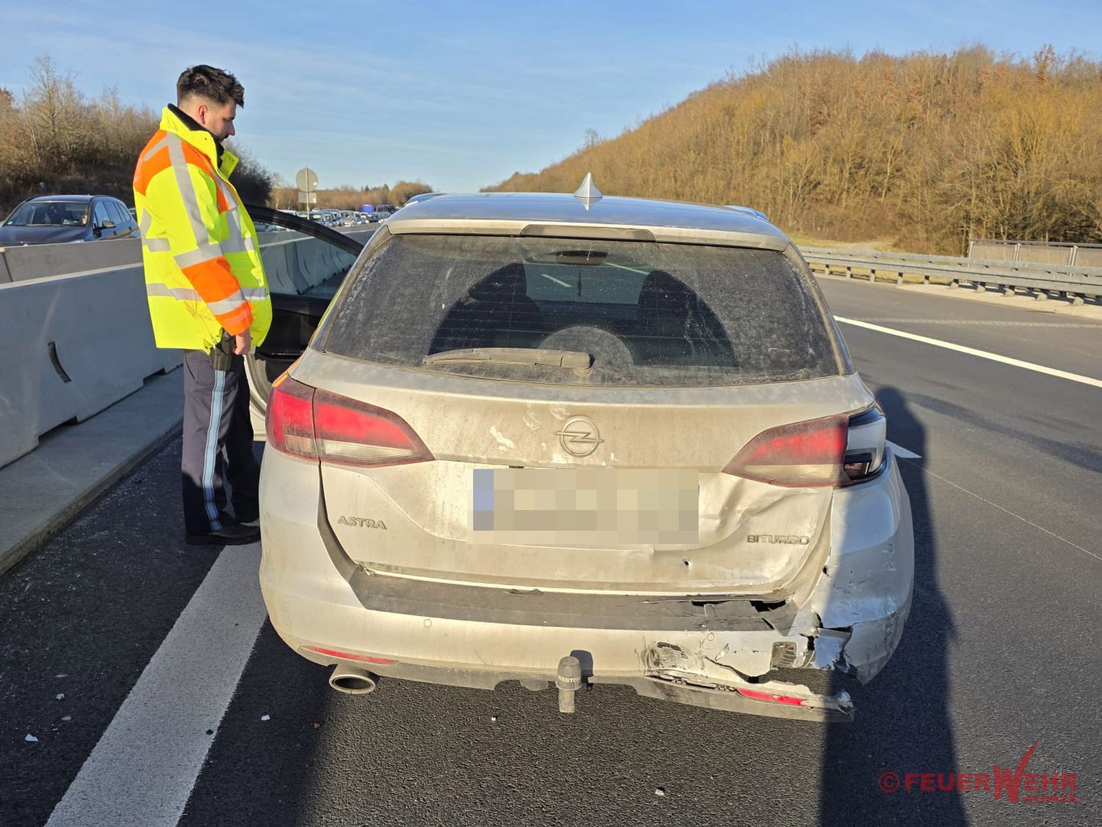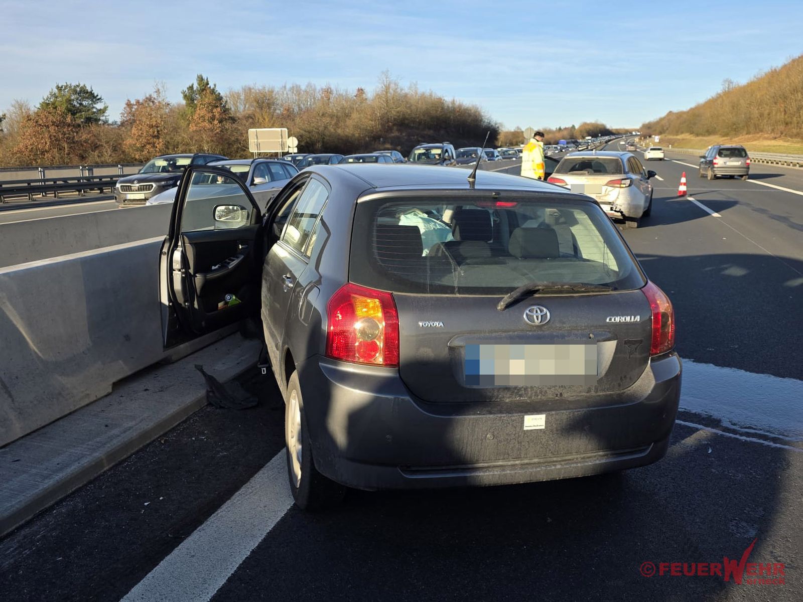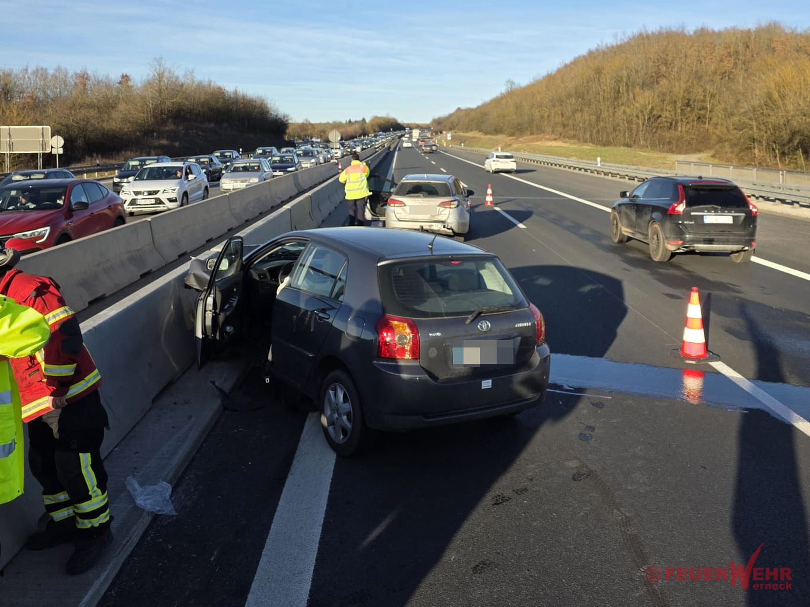 Auf dem linken Fahrstreifen kollidierten zwei Pkw miteinander, wobei das hintere Fahrzeug zusätzlich mit der Betonleitwand zusammenstieß. Dabei wurden zwei Personen leicht verletzt.