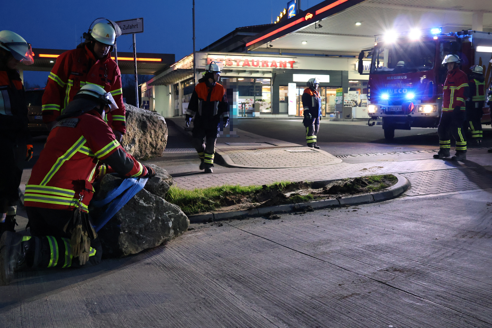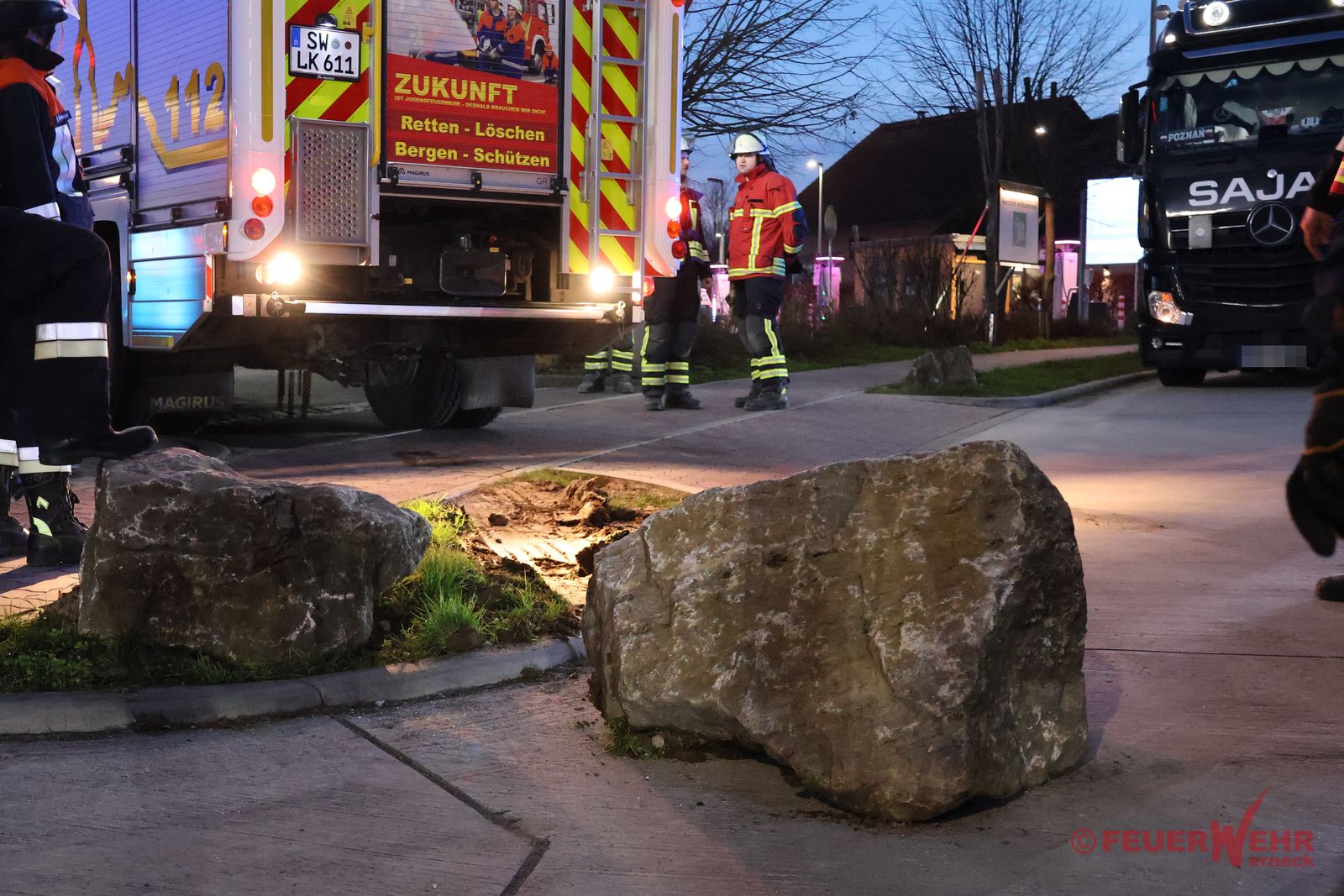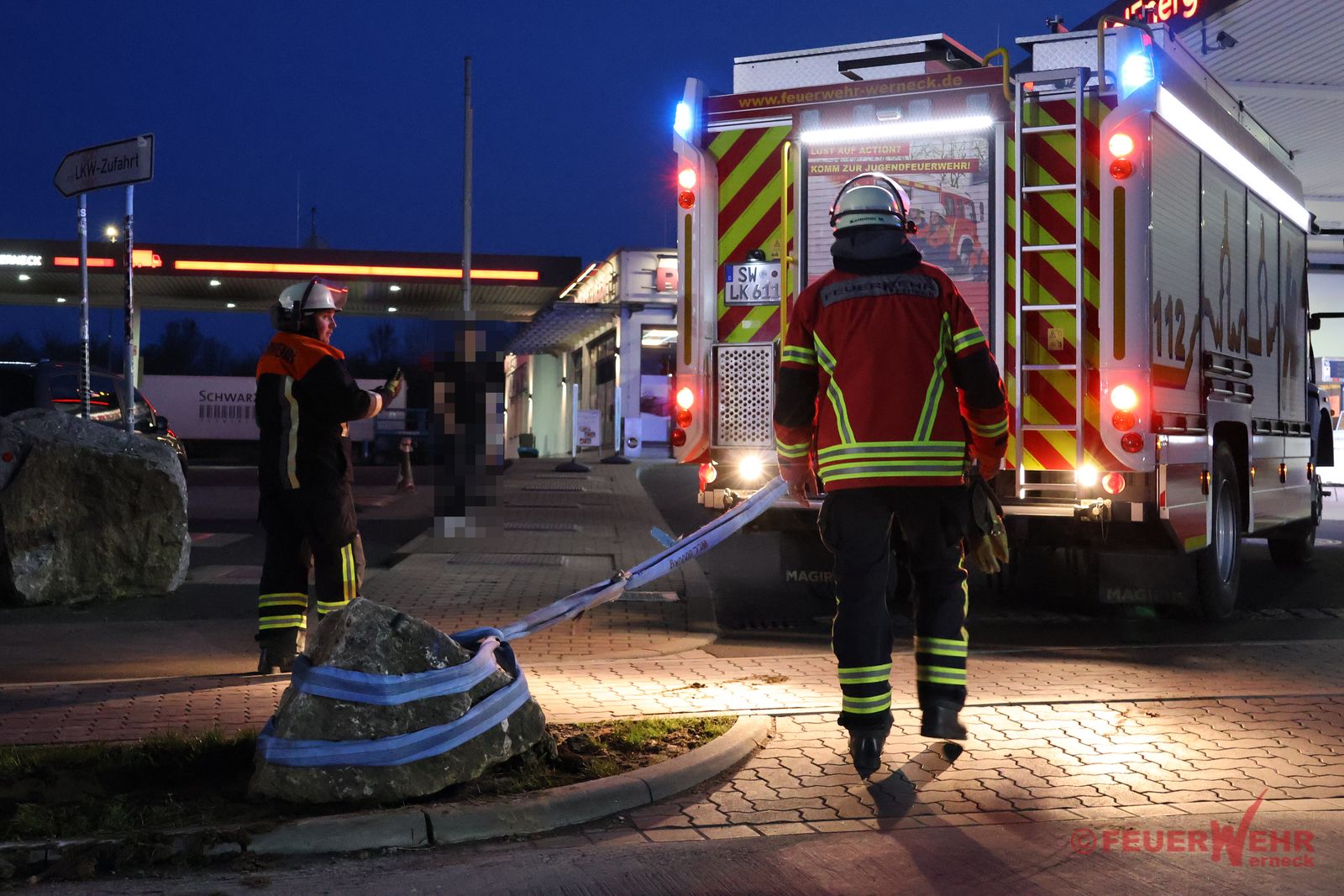 Am Samstagabend wurden die Feuerwehren aus Ettleben, Schnackenwerth und Werneck unter dem Stichwort „Technische Hilfe allgemein“ in das Gewerbegebiet Am Eschenbach alarmiert. An der Einfahrt der dortigen Raststätte blieb ein Lkw beim Abbiegen an einem großen Stein hängen, der sich unter dem Auflieger verkeilte.