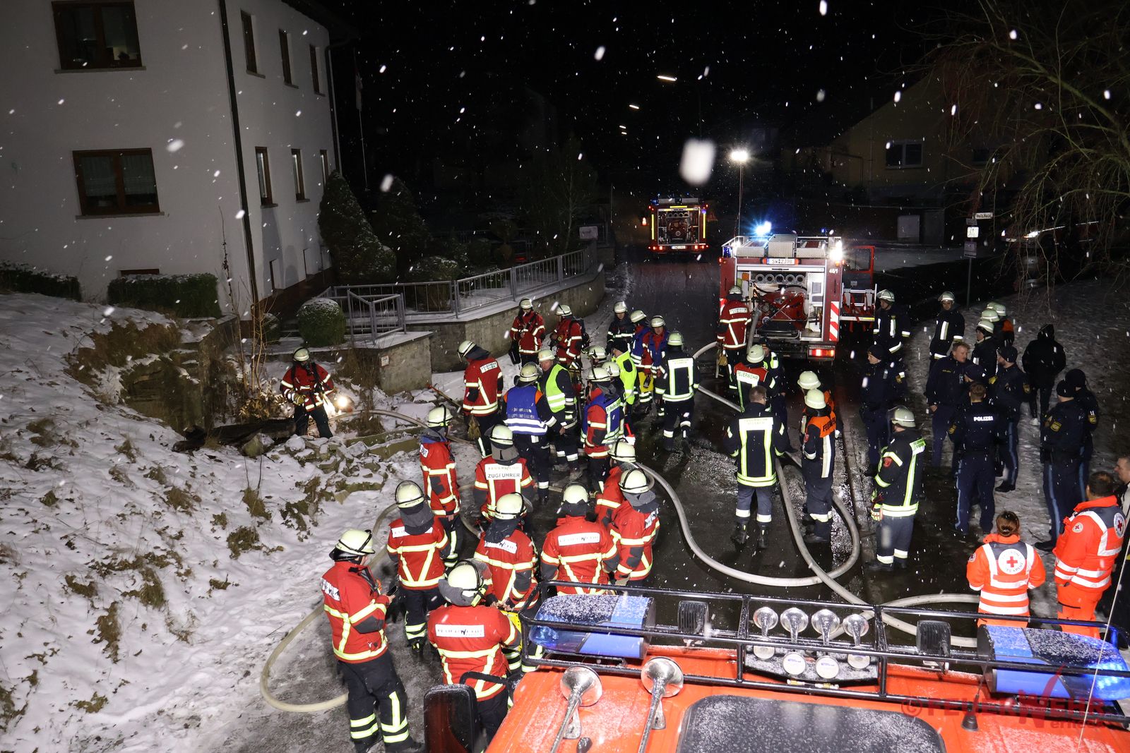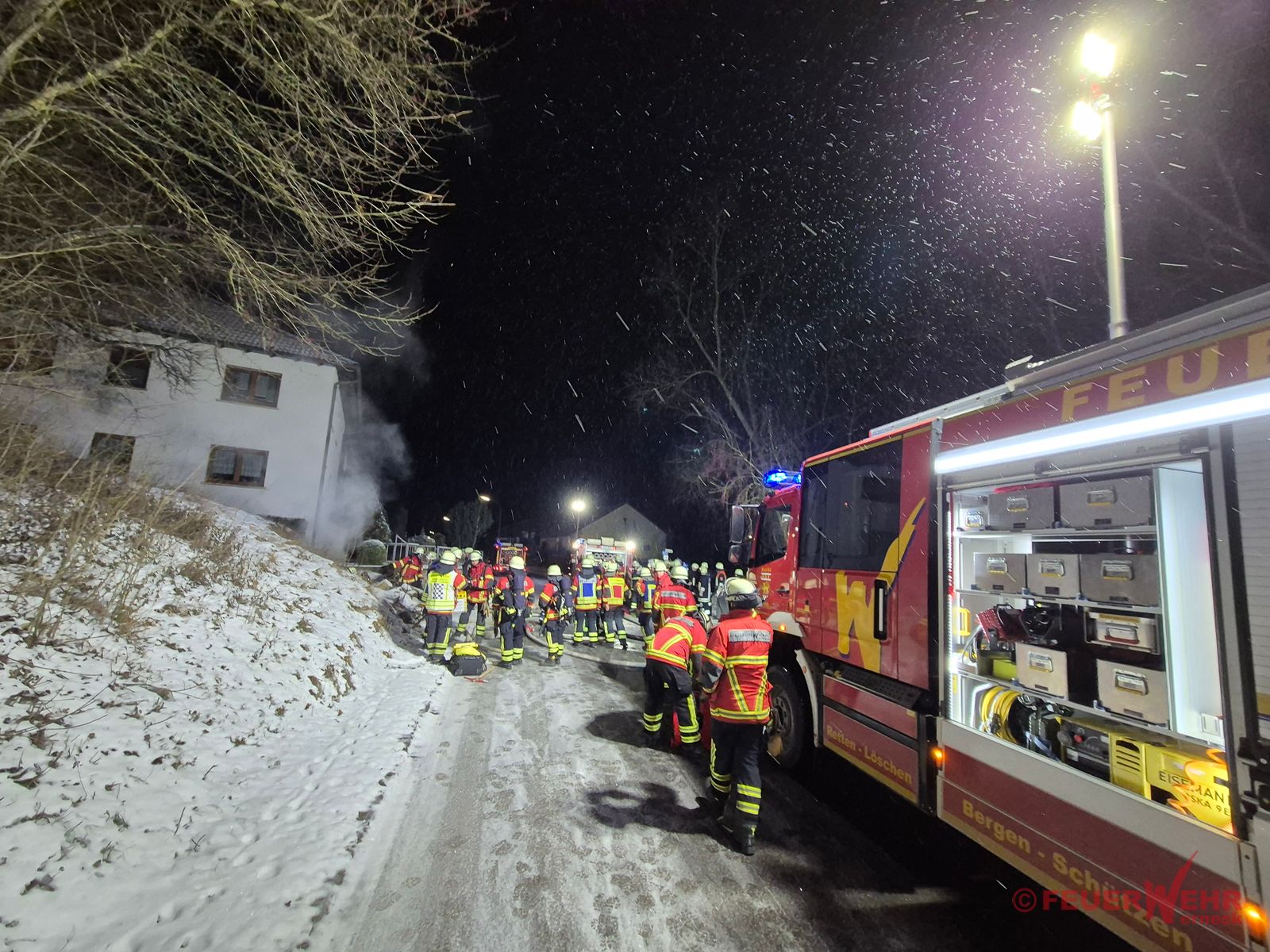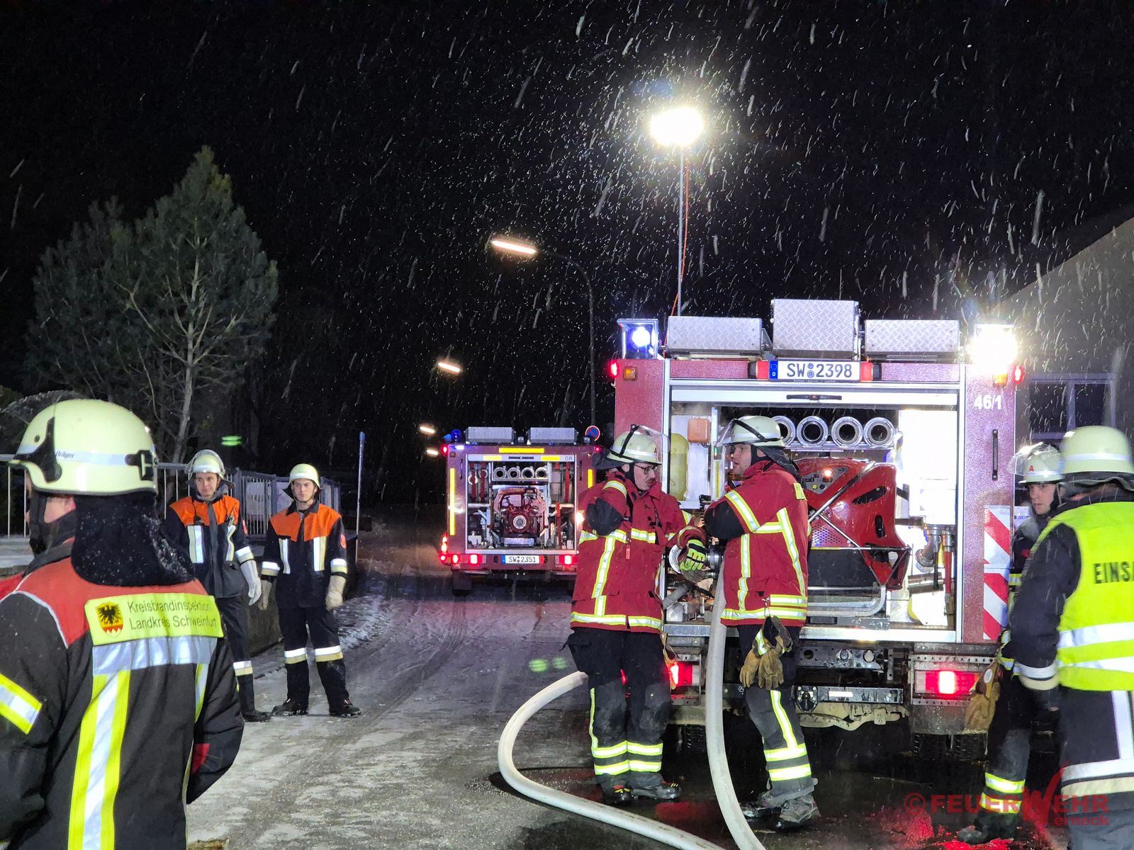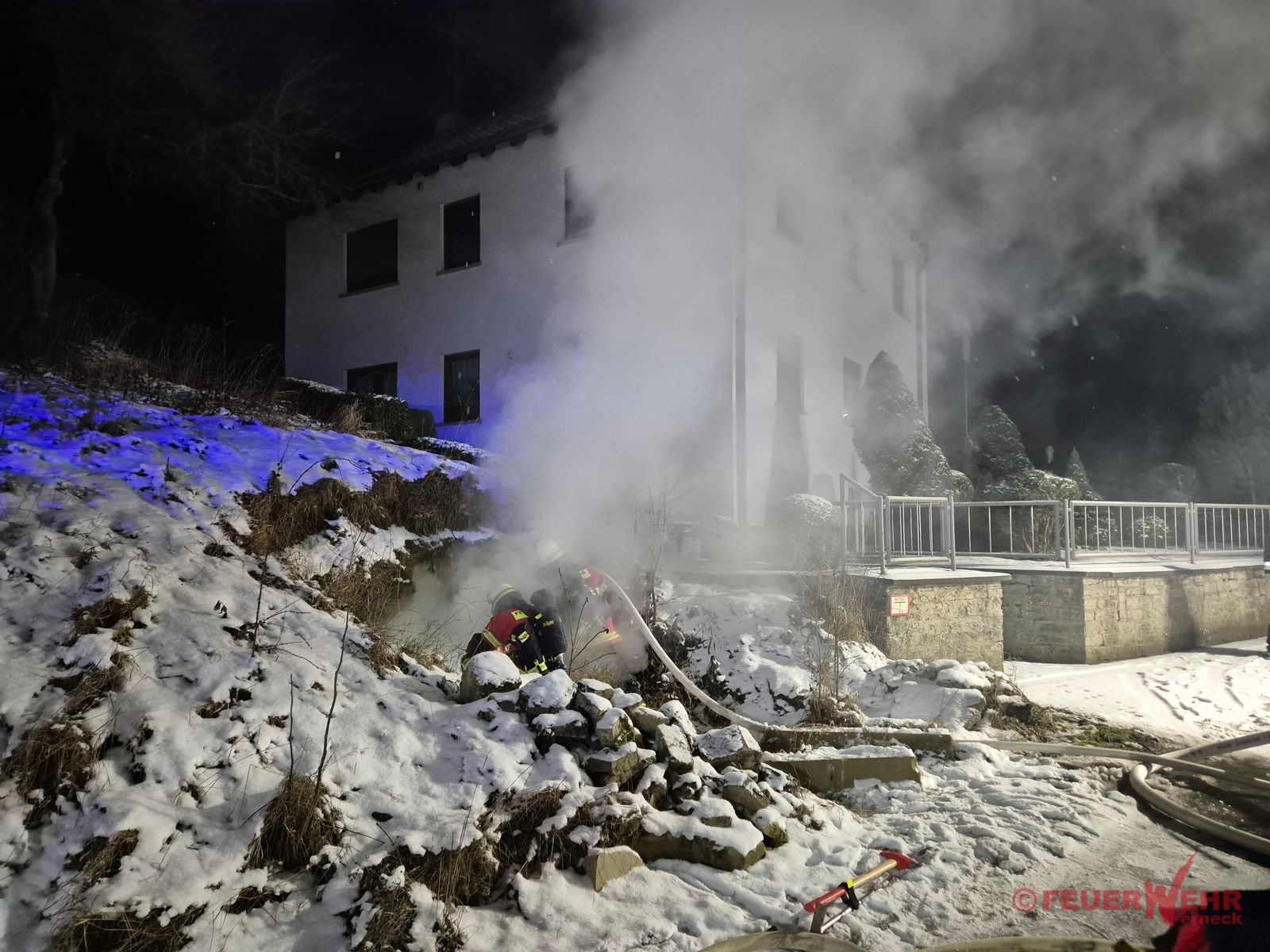 Die zuerst eintreffenden Kräfte der Feuerwehr Mühlhausen bestätigten die gemeldete Lage: In einem abseits gelegenen Kellergewölbe in unmittelbarer Nähe eines Wohnhauses brannten Unrat sowie mehrere massive Holzbalken. Bei Eintreffen der Feuerwehr Werneck war bereits ein Trupp der Feuerwehr Eßleben unter schwerem Atemschutz zur Brandbekämpfung im Keller eingesetzt.