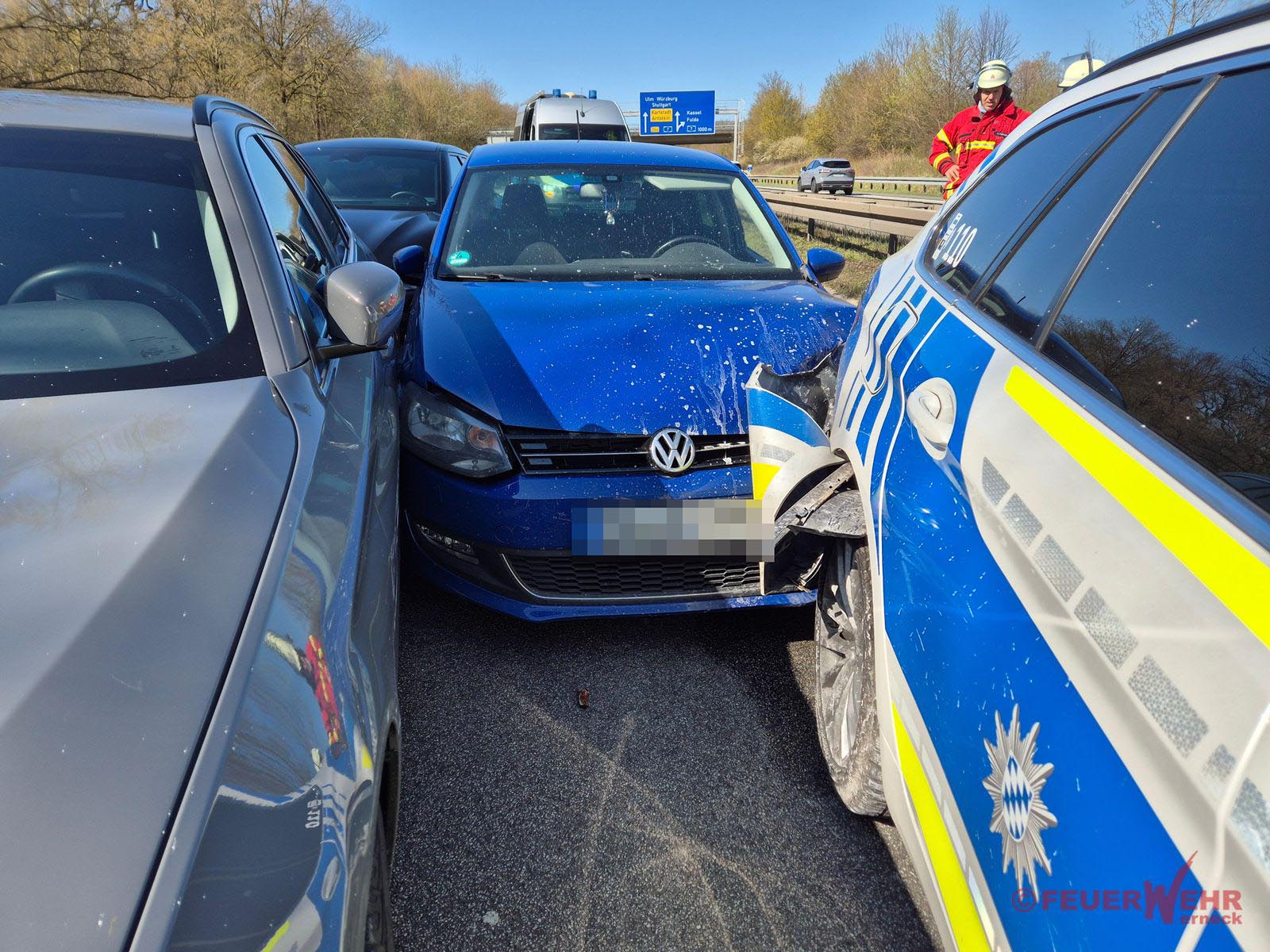 Am Donnerstagvormittag wurde die Feuerwehr Werneck von der Polizei auf die A70 angefordert. Zwischen Autobahndreieck Schweinfurt-Werneck und der Anschlussstelle A70 endete eine Verfolgungsjagd mit einem VW Polo, indem dieser von drei Einsatzfahrzeugen der Polizei gestoppt wurde. Aufgrund der beschädigten Fahrzeuge musste die Fahrbahn gereinigt werden.
