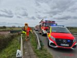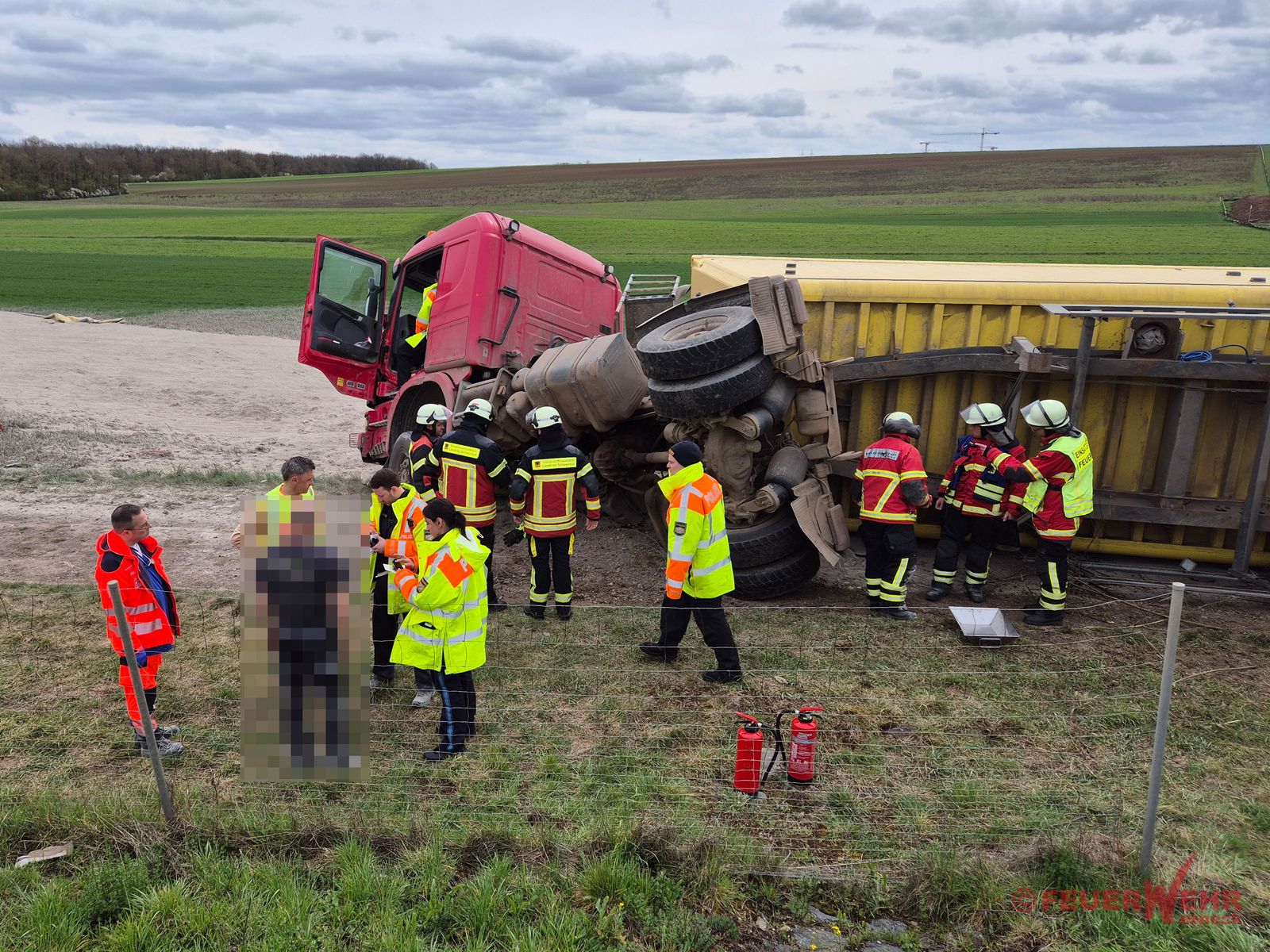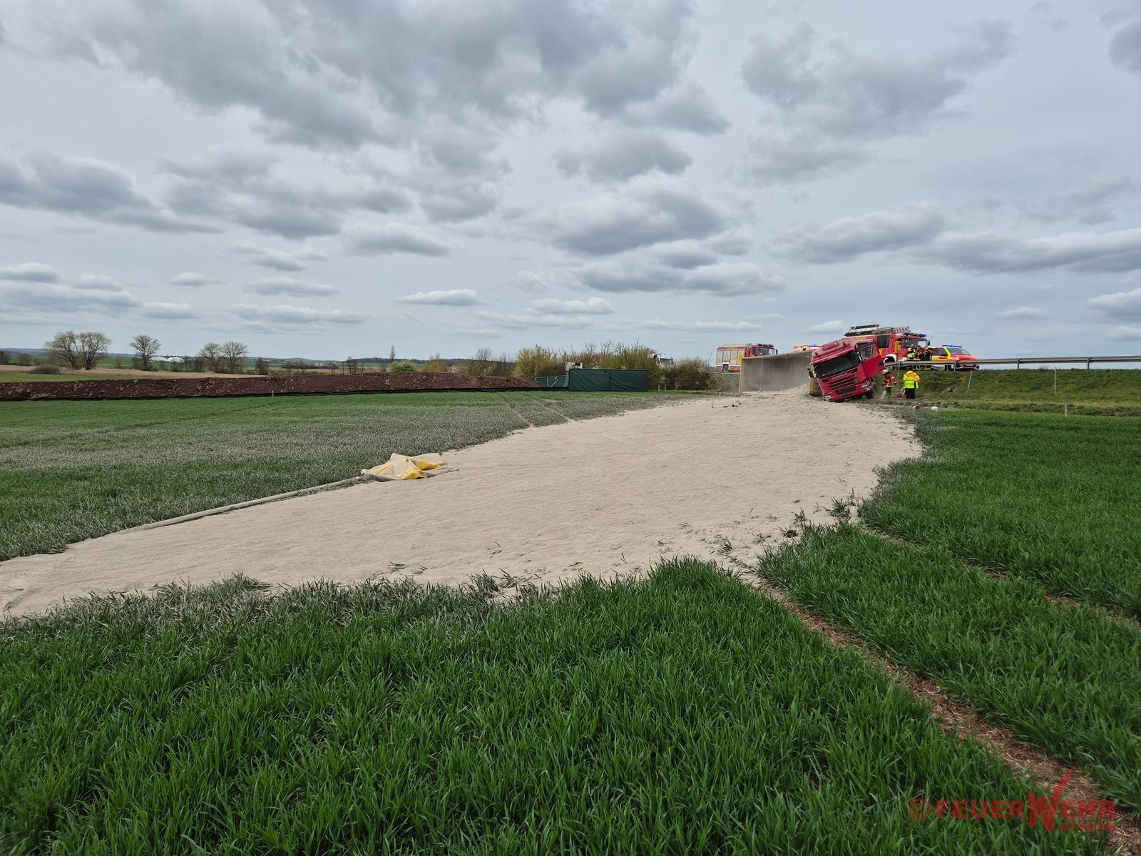 Am Freitagmittag wurden die Feuerwehren aus Bergrheinfeld und Werneck zu einem verunfallten Lkw auf die A70 alarmiert. Zwischen der Anschlussstelle Werneck und dem Autobahndreieck Werntal kam ein Lkw in Fahrtrichtung Bamberg aus noch ungeklärter Ursache von der Fahrbahn ab, durchstieß die Leitplanke und kam nach einer Böschung auf der Seite auf einem angrenzenden Feld zum Liegen. Dabei verlor der Schüttgutauflieger den geladenen Kalkdünger, der sich großflächig auf dem Feld verteilte.